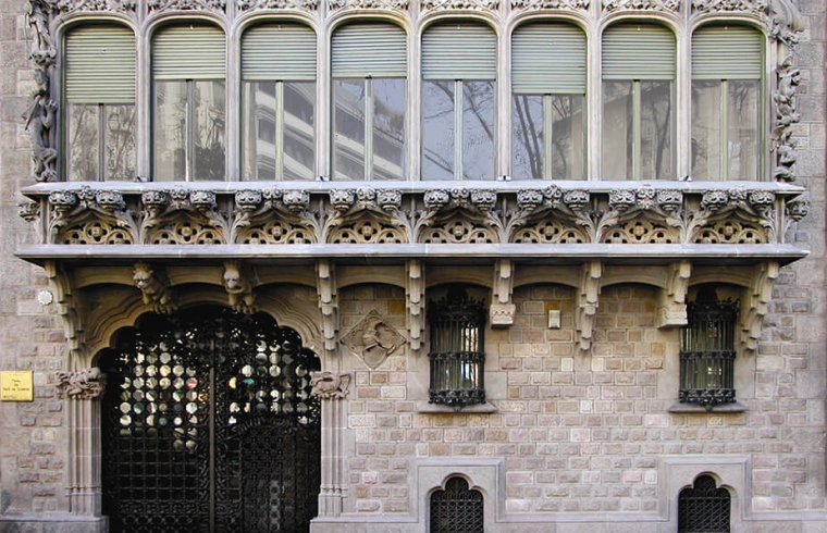 El elemento más destacado es la inmensa tribuna que recorre la planta noble. Está cuajada de figuras esculpidas: santos, caballeros, personajes grotescos y motivos florales que parecen brotar de la propia piedra. Es una fachada que exige ser leída con calma. Si te fijas bien, verás a San Jorge luchando con el dragón, un símbolo recurrente que aquí alcanza una sofisticación de detalle casi gótica. Esta cara del edificio es el «traje de gala», la imagen pública que el Barón de Quadras quería proyectar a la arteria más importante de la ciudad: una imagen de linaje, tradición y nobleza.